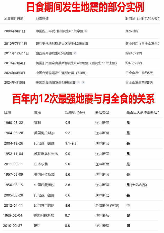 日本科学家曾研究全球最大地震与月相的关系,发现自1900年以来全球12次最大地震(Mw8.5级以上)中9次发生在满月或新月附近(新月正是日食可能发生的时期)。
