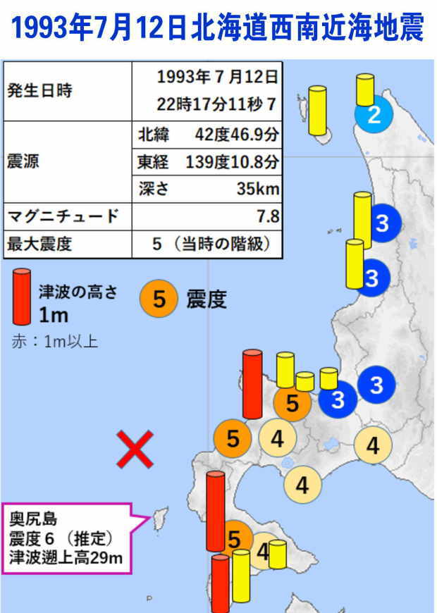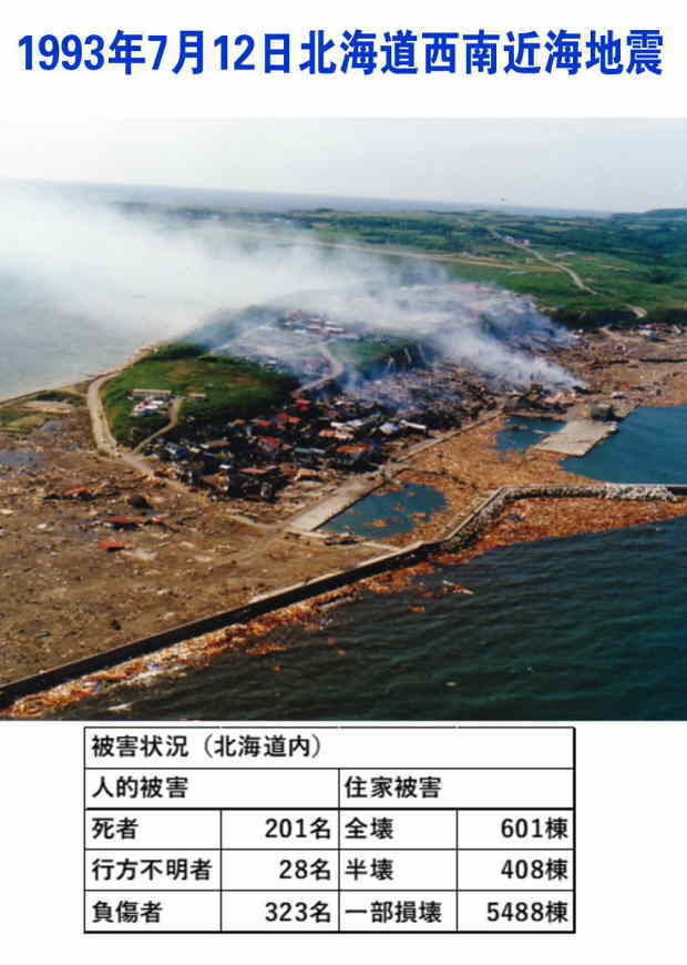 西海岸主要有来自日本海盆缘断层带(奥尻海岭周边)的威胁,如1993年7月12日的北海道南西沖地震(M7.8),这是日本战后最具代表性的“日本海盆缘逆断层型海啸地震”之一,直接导致奥尻岛大规模海啸灾害和火灾,死亡人数230人。