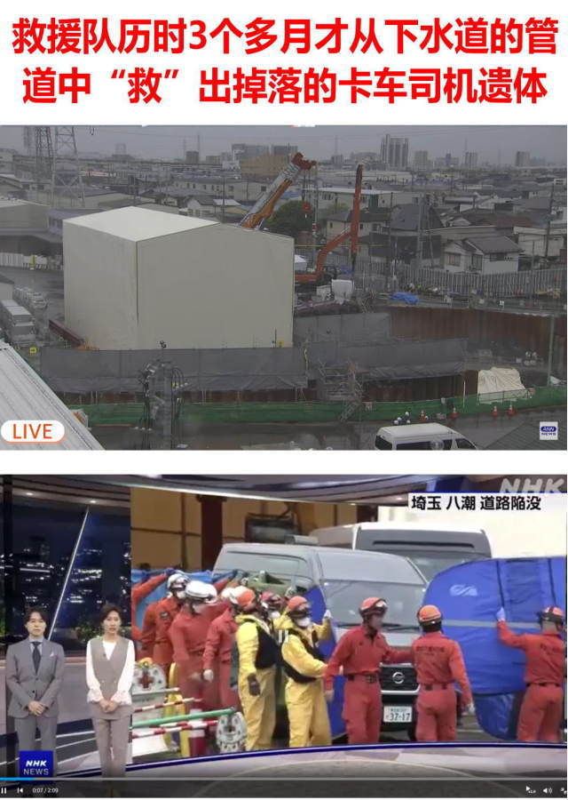 2025年1月28日,埼玉县八潮市发生了一件诡异而恐怖的意外事件:一个十字路口,大白天路面突然塌陷,一辆急驶而过的卡车被当场吞噬,随着救援队的救援工事展开的同时,塌陷的洞穴又发生了数次塌陷,并在数日后形成深达数十米的“天坑”,救援队最终历时3个多月,才从“天坑”中一个下水道的管道中“救”出掉落的卡车司机遗体,周边地区居民的正常生活也因此次事件瘫痪数月之久。