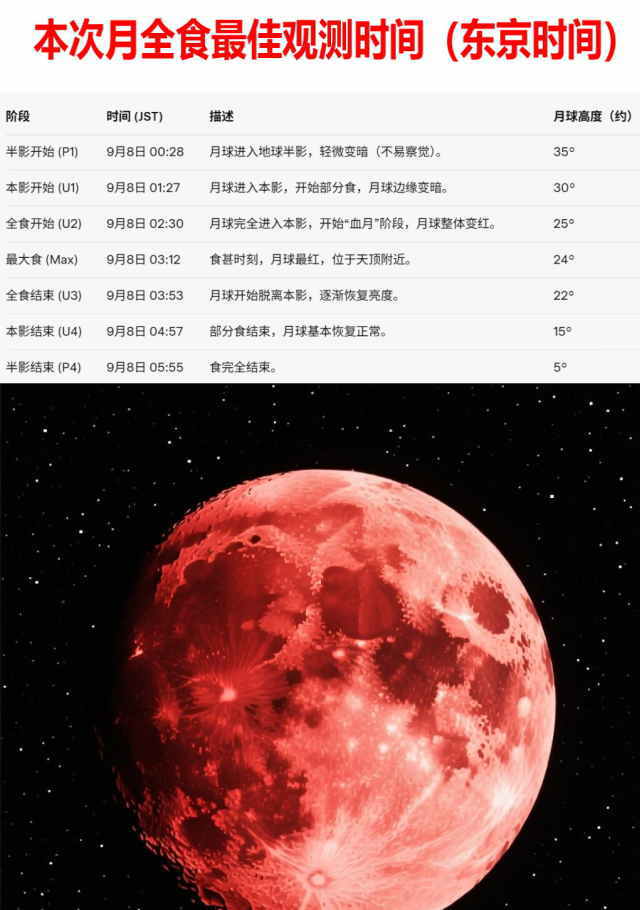 本次月全食最佳观测时间为9月8日凌晨1:27到4:57(东京时间),焦点在全食阶段(2:30-3:53)。北京时间为9月8日凌晨0:27到3:57,焦点观测时段为1:30-2:53。