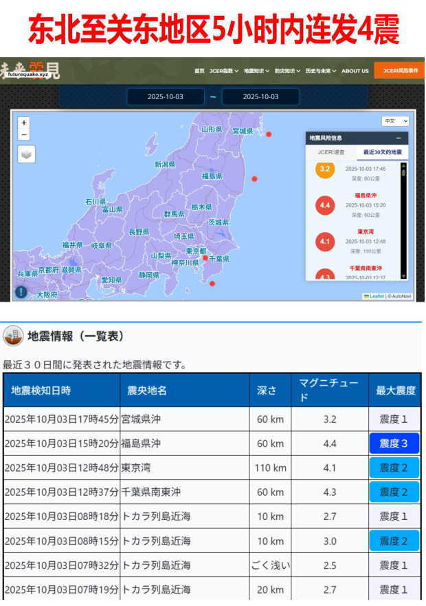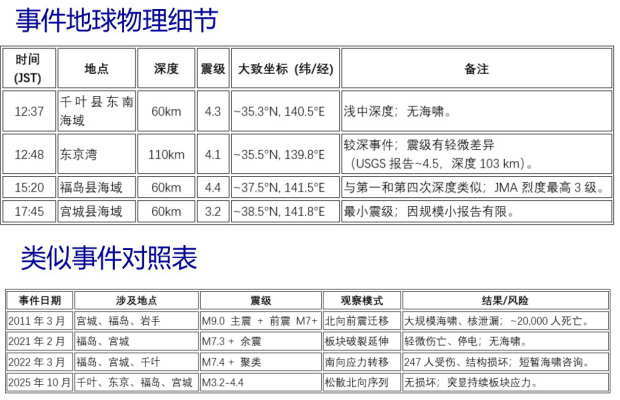 其中3次(千叶南東沖、福島沖、宮城沖)深度60km,属于俯冲板片顶部或板内的中等深度地震带,东京湾那次属于更深的“中深度”地震,可能与板块弯曲或脱水过程相关。